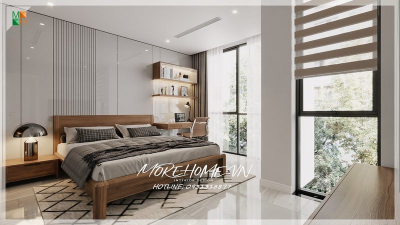 Bàn làm việc bằng gỗ đặt trong phòng ngủ bàn đơn đặt sát tường kết hợp với kệ sách giúp cho không gian được ngăn nắp và gọn gàng.