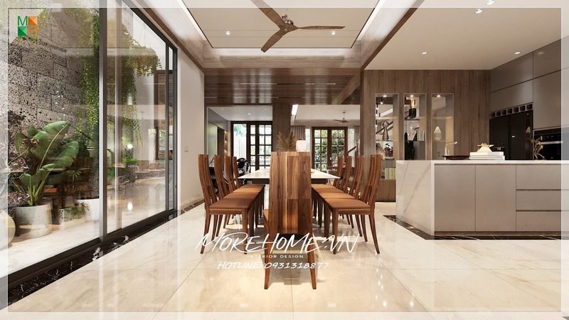 Kết hợp giữa phong cách thiết kế hiện đại cao cấp với cách bố trí hợp lý các món đồ nội thất, không gian bếp ăn được tạo ra là một cảnh lý tưởng mà đông đảo các chủ hộ mơ ước.
